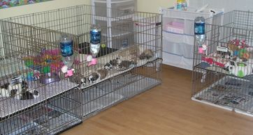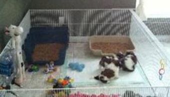 They have lots of room to run and plenty of toys to play with. They have access to dry food at all times and twice a day I make them their stew.....which consists of soaing dry food in hot water and some canned food. They have water bottles to drink from so they don't make a huge mess.